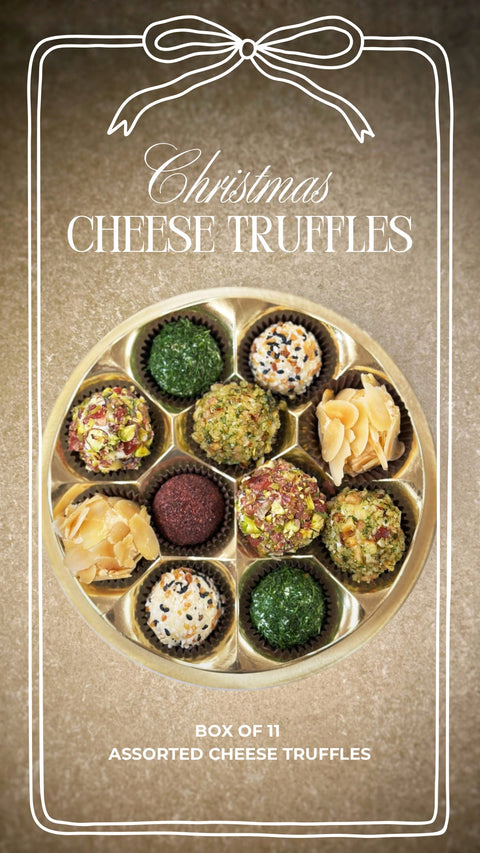 A generously portioned platter of hand-rolled cheese truffles, thoughtfully curated for effortless sharing. Featuring a luxuriously creamy centre and an array of refined, textural coatings, this indulgent assortment invites guests to explore a spectrum of flavours — from fresh and herbaceous to nutty, spiced, and delicately sweet. Designed as a striking centrepiece for festive tables and celebratory spreads.
